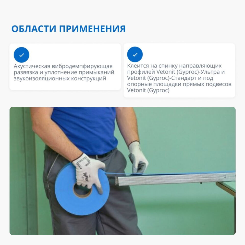 Уплотнительная поризованная лента из вспененного полиэтилена с акриловым клеевым слоем на водной основе. Обладает вибродемпфирующими, а также оптимально подобранными клеевыми свойствами. Синий цвет ленты позволяет легко идентифицировать ее наличие в конструктивах. Область применения - акустическая вибродемпфирующая развязка и уплотнение примыканий звукоизоляционных конструкций перегородок, потолков и облицовок в местах сопряжения с другими конструкциями. Обеспечивает звукоизоляционные характеристики конструкций, компенсацию неровностей и подвижек сопрягаемых конструкций. Защищает поверхность профилей, на которую приклеена лента, от коррозии при контакте с влажными основаниями.