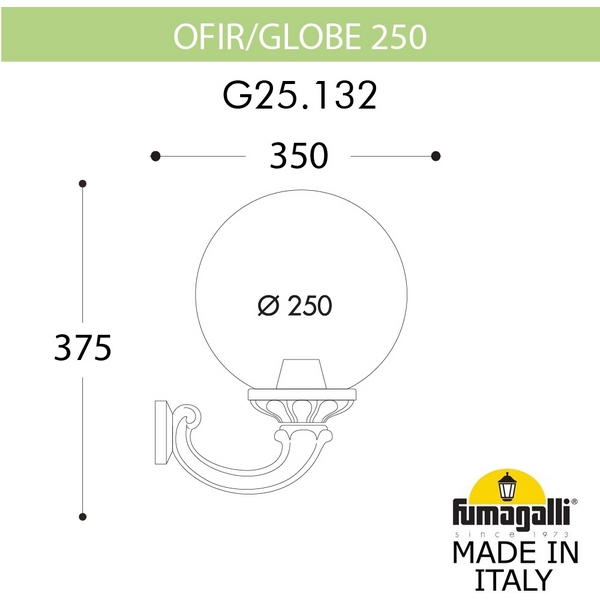 Светильники уличные настенные FUMAGALLI серии GLOBE 250, модель GLOBE 250/OFIR. Консольный уличный светильник для монтажа на стену. Настенный кронштейн OFIR среднего размера и светильник - шар GLOBE 250. Используются для фасадного и архитектурного освещения в стиле "классика". Место установки уличных светильников - фасады, колонны и другие вертикальные поверхности исторических зданий, котеджей, загородных домов, церквей, а так же, другие места где требуется и возможна установка фонарей. Изготовлены в Италии, по уникальным технологиям "FUMAGALLI" из современного композитного полимера RESIN. Этот материал в 5 раз прочнее металла, не ржавеет, не окисляется, не выгорает на солнце, его не нужно красить. Все светильники пыле-влаго защищены по стандарту IP55 (Пыленепроницаемые, защита от водяных струй с любого направления). Рассеиватель выполнен из антивандального, не мутнеющего и не горючего PMMA (ПолиМетилМетаАкрилат). Срок службы светильника - не менее 20 лет. Температура использования от -60 до +90. В серии GLOBE 250 есть фонари в настенном (BISSO/GLOBE 250, OFIR/GLOBE 250, MIRRA/GLOBE 250, PORPORA/GLOBE 250) подвесном (SICHEM/GLOBE 250) и наземном исполнении (IAFAET.R/GLOBE 250, ALOE.R/GLOBE 250, ARTU/GLOBE 250, GIGI/GLOBE 250, RICU/GLOBE 250, RICU/ISSO/GLOBE 250 1L, RICU/ISSO/GLOBE 250 2L, RICU/ISSO/GLOBE 250 3L) со столбами разной высоты, с разным количеством и конфигурацией голов. Консоли настенных фонарей и кронштейны светильников на столбах освщения могут устанавливаться вверх/вниз. Столбы выше 150 см имеют в основе мощную стальную трубу с двойной оцинковкой. При заказе требуется выбрать цвет корпуса, цвет плафона и тип патрона. По стилю и дизайну серия уличных светильников GLOBE 250 похожа на светильники большого размера GLOBE 400 и на светильники среднего размера GLOBE 300. Тип крепления: Монтажный комплект (дюбель/саморез/декоративный колпачок). Комплектация: С уличной лампой "FUMAGALLI" яркостью 800Lm. Спец. для улицы, с защитой от скачков напряжения, перепадов температуры и повышенной влажности.