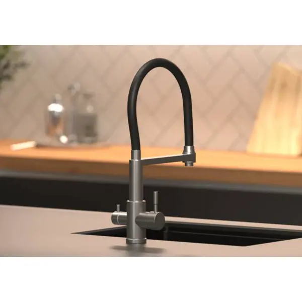 Смеситель кухонный Osgard высота 44 см с гибким изливом цвет черный - это универсальное решение для кухни, которое может быть использовано для различных целей, включая мытье посуды, приготовление пищи и другие кухонные нужды. Однорычажный смеситель OSGARD позволяет легко регулировать температуру и напор воды, что делает его удобным в использовании. Кроме того, смеситель имеет съемный носик, который облегчает его чистку и техническое обслуживание.