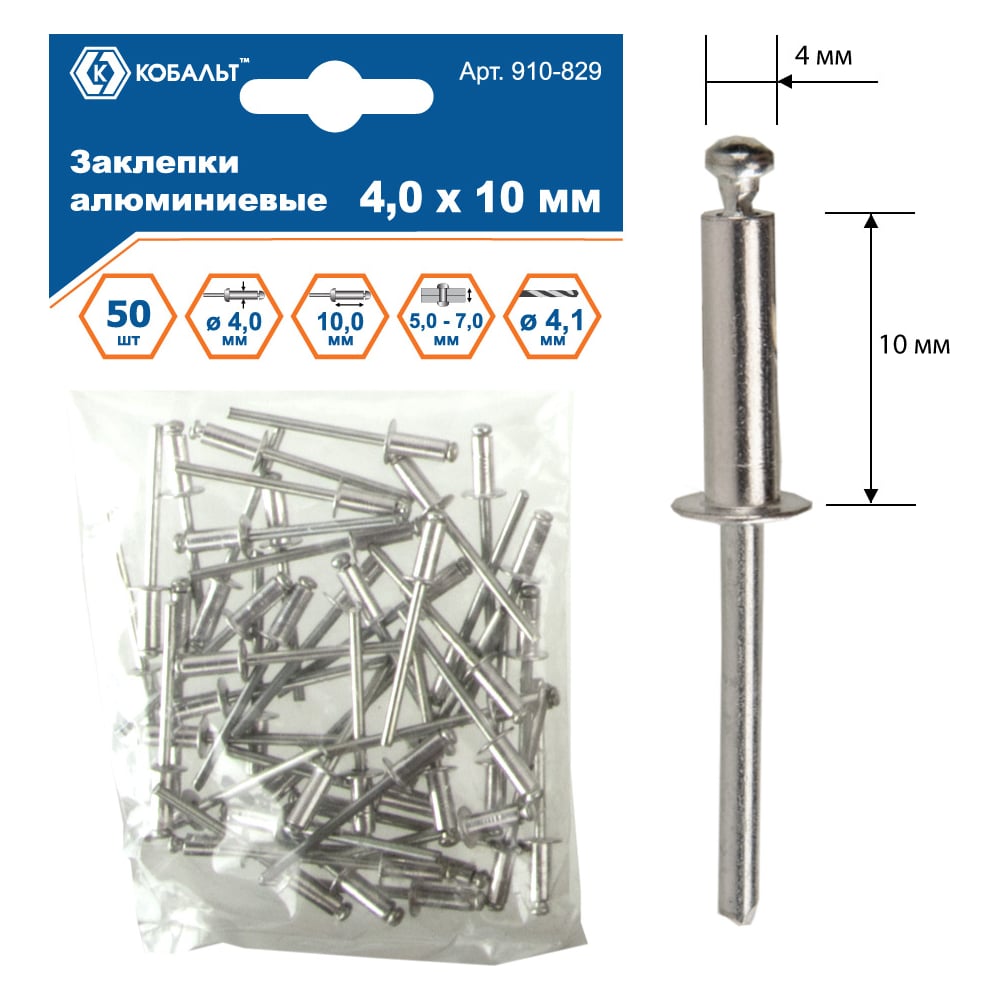 Вытяжные алюминиевые заклепки КОБАЛЬТ 4.0х10 мм (50 шт.) 910-829